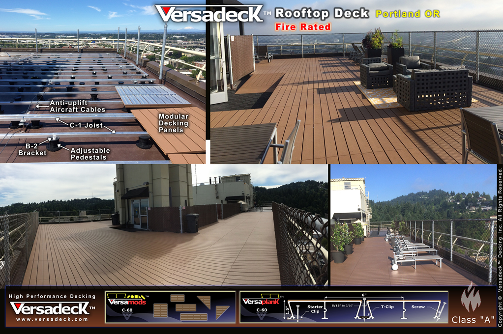 Rooftop Deck System is Class "A" Fire Rated Versadeck rooftop deck systems provide turnkey solutions for your roof deck needs. We provde a design take off including everything you need from the materials, design plans, installation instructions to the technical support. Options include Class "A" fire rated aluminum joist framing, plank decking, watertight decking or modular-panelized decking as well as stair treads, ramps and aluminum railing. Versadeck's class "A" polyurea deck coating is 25 times thicker than the other powder painted aluminum decking options, making it more durable, slip resistant, quieter, and cooler in the hot sun. Rooftop Decks Price List (see page-8)