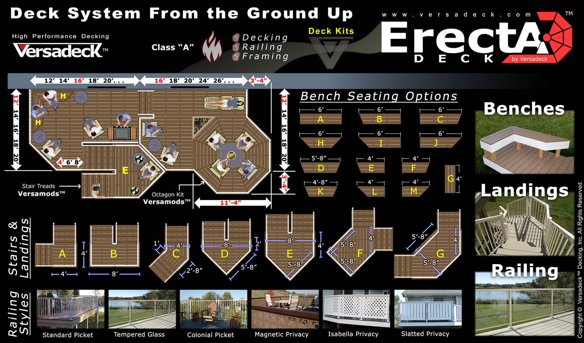 Aluminum Deck System from the Ground Up Class A Fire Rated Deck System is 100% aluminum construction with high end class A protective coatings. Versadeck deck kits are deck design package options which can be customized, sized and modified to fit your home and lifestyle. Versadeck deck components have been approved for use on most class "A" fire rated decking required applications. (Aluminum Decking, Aluminum Deck Framing, Aluminum Railing and Aluminum Modular Stairs). Check with your city planner to make sure they allow aluminum decking, framing and railing as a class A fire rated deck solution.